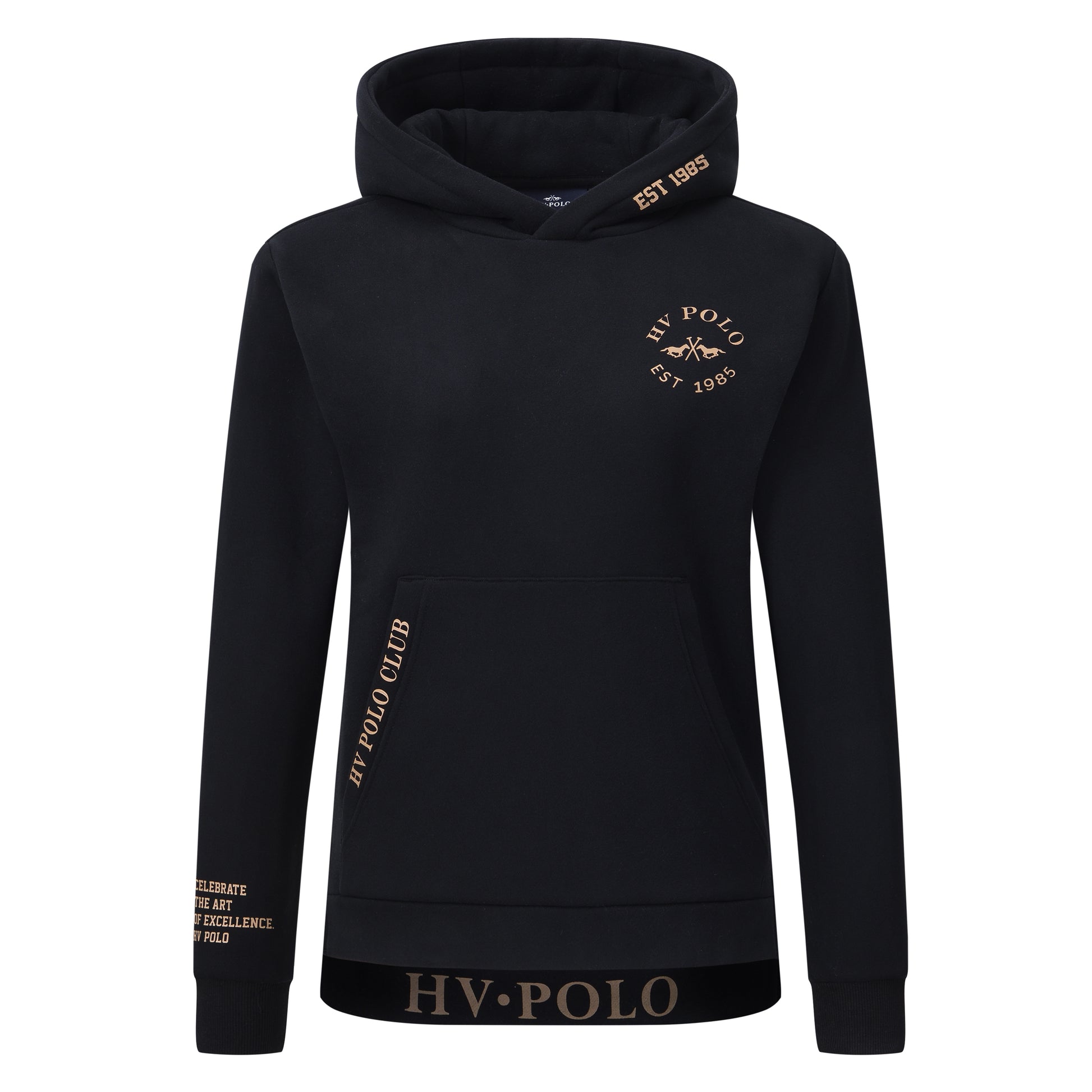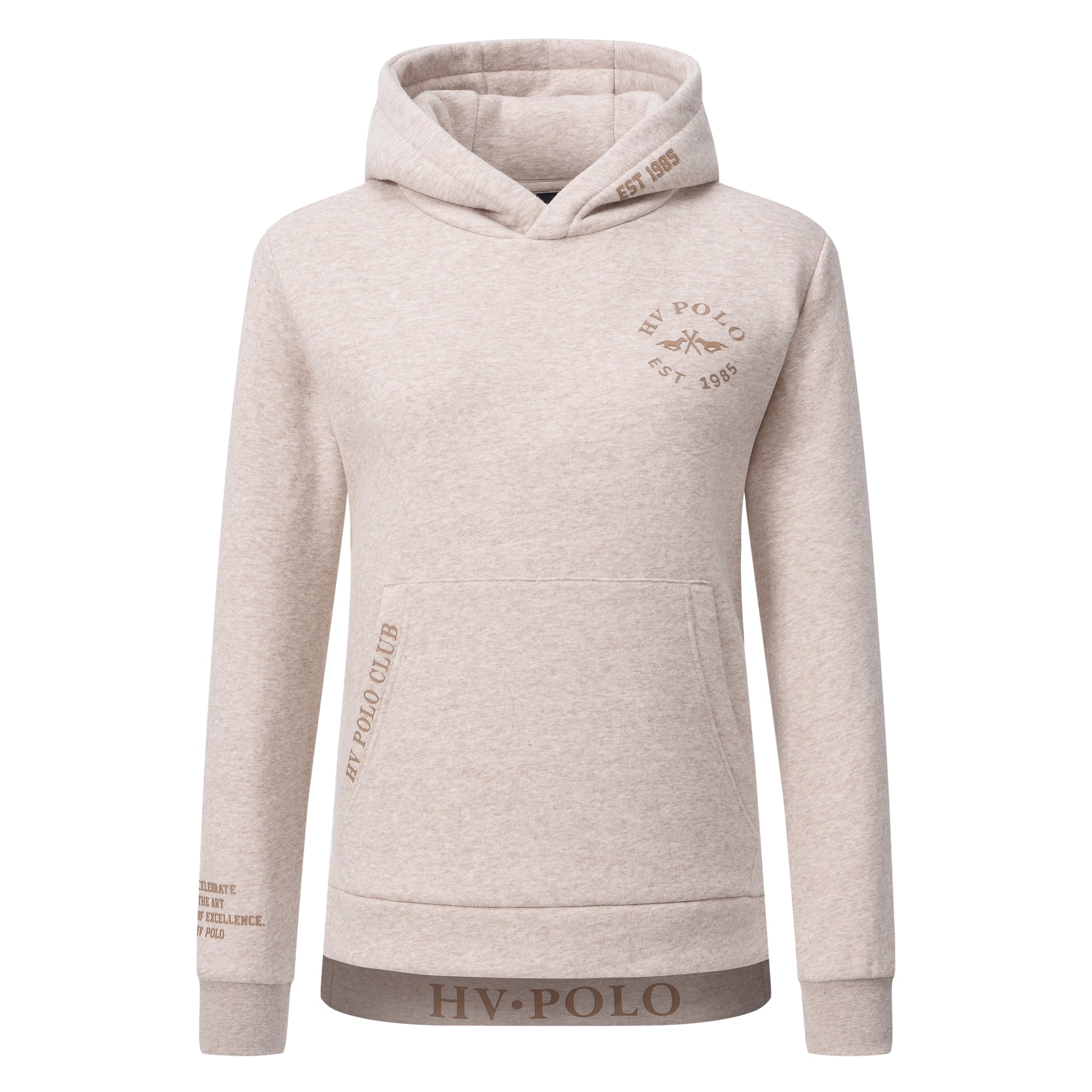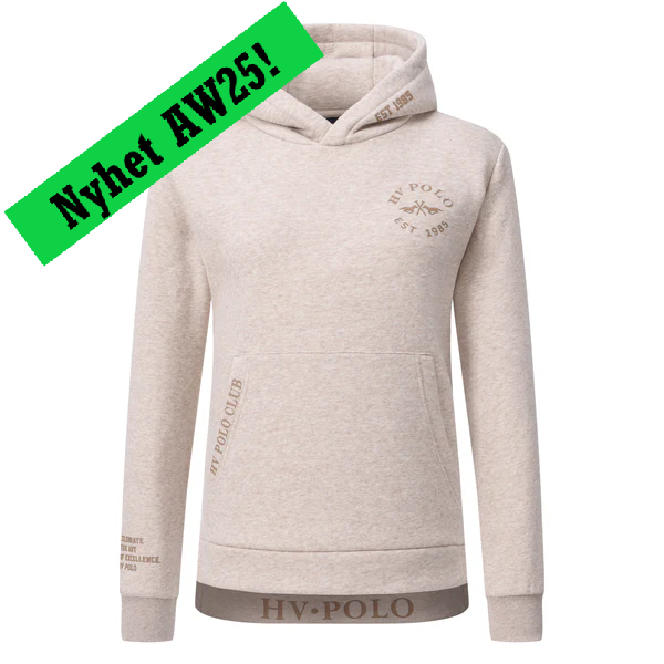 Mjuk hoodie med huva samt fickor framtill. HV Polo loggor och text på flera ställen.